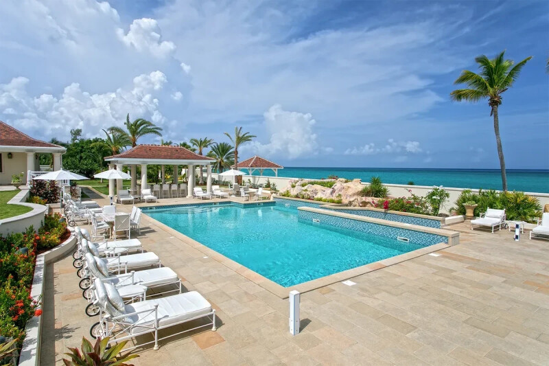Le Château des Palmiers is a world-class beachfront estate that includes a 5-bedroom ocean side villa and a 4-bedroom garden side villa. Situated on the white sand beach at Plum Bay, this fabulous property provides an intimate, relaxed and attentive environment within the walls of a gated enclave. The many amenities include a huge heated pool, an open air and air conditioned fitness center, a tennis court, and covered outdoor bar, billiards and dining areas. The ocean side villa features 5 King Size bedrooms with full private baths including a two-storey master suite with a master bath with Jacuzzi tub and two private balconies facing the pool and the ocean. The remaining interior spaces include a fully equipped kitchen, a formal living room, a formal dining room seating 10 and a casual outside dining area and a media room.