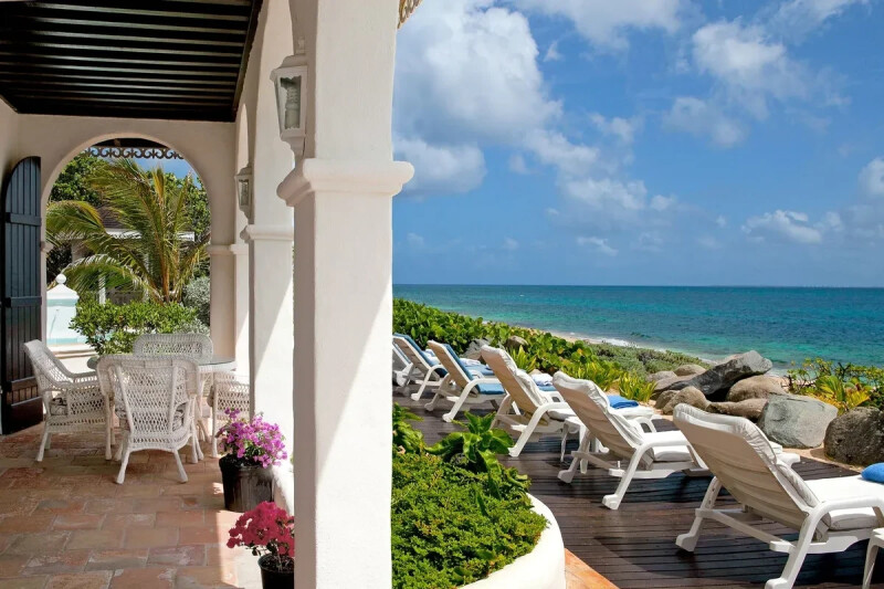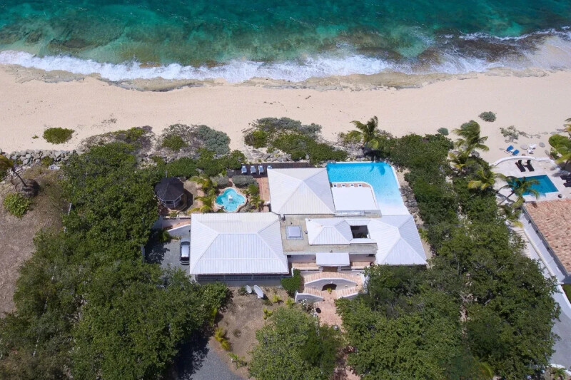 Impressive beachfront "Hacienda-style" property located in the exclusive residential neighborhood of Terres Basses, directly on the fabulous beach of Baie Rouge on French St. Martin's northern coastline.
